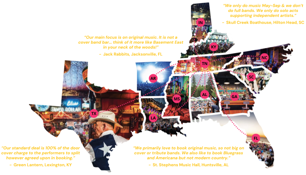 Our database identifies ideal venues for artists, ensuring performances align with each venue’s music preferences and audience demographics. These venues are eager to support Nashville’s independent artists, creating unique opportunities for authentic connections and audience growth.